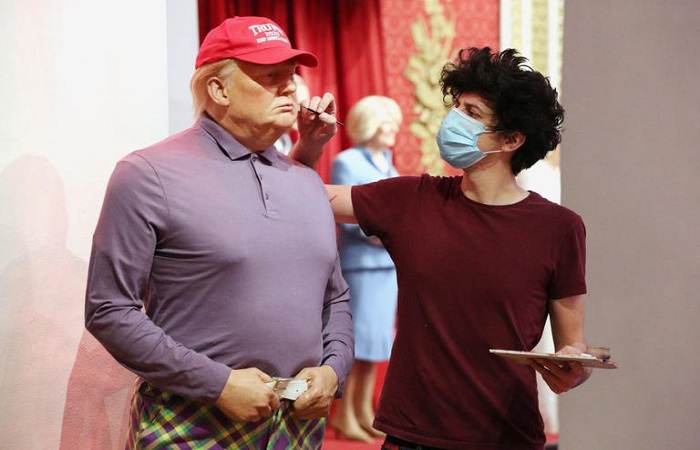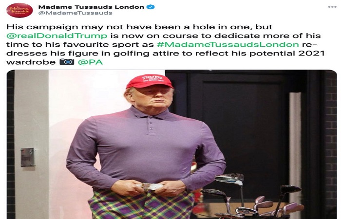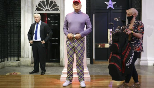 في خطوة رمزية تشير إلى انتهاء فترة حكمه، قررت إدارة متحف مدام توسو الشهير في لندن تبديل ملابس تمثال دونالد ترامب الشمعي، بطقم رياضي لممارسة لعبة الغولف.