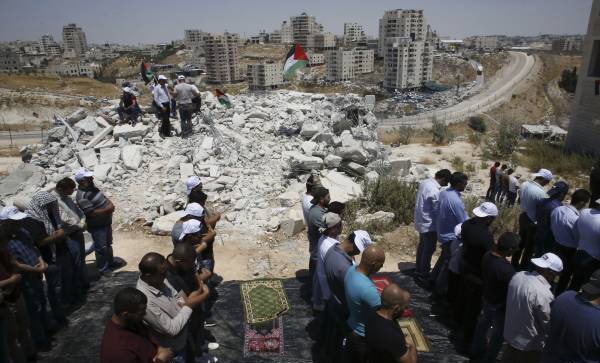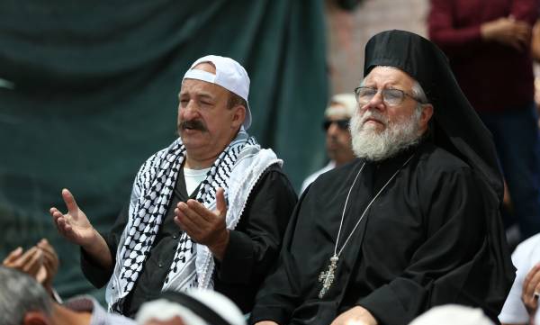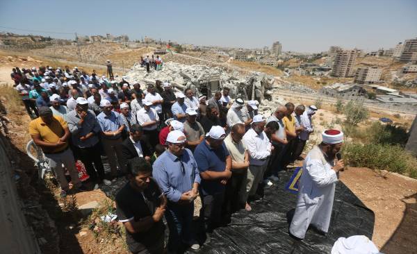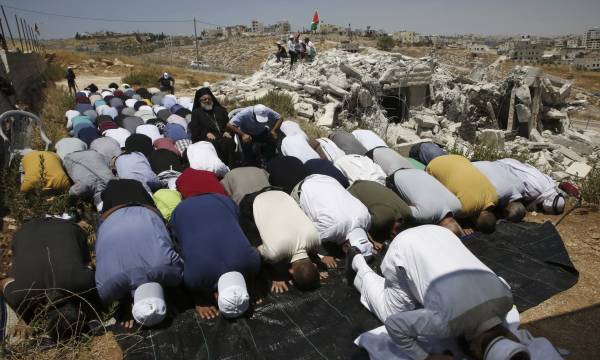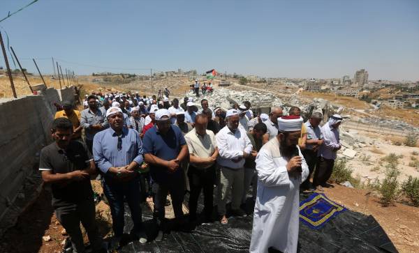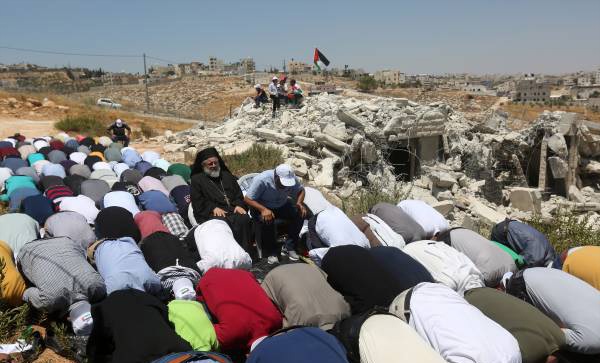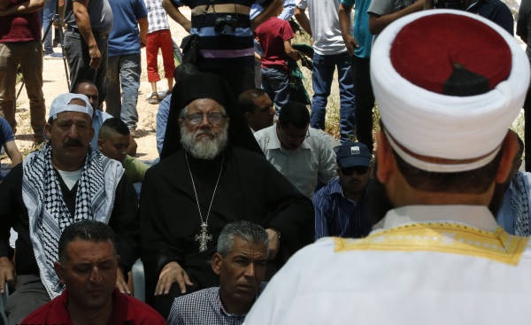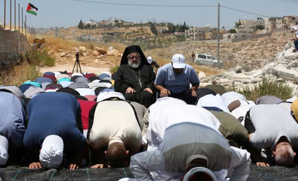Christian Priest among Palestinian Protesters Praying beside Demolished Homes in Dar Salah