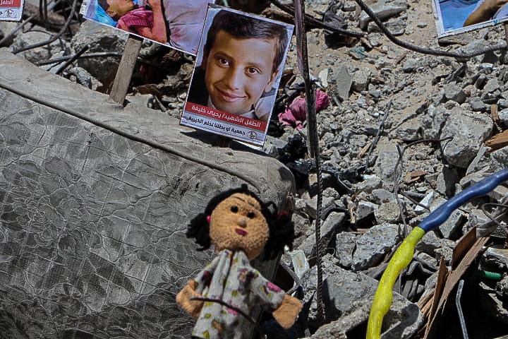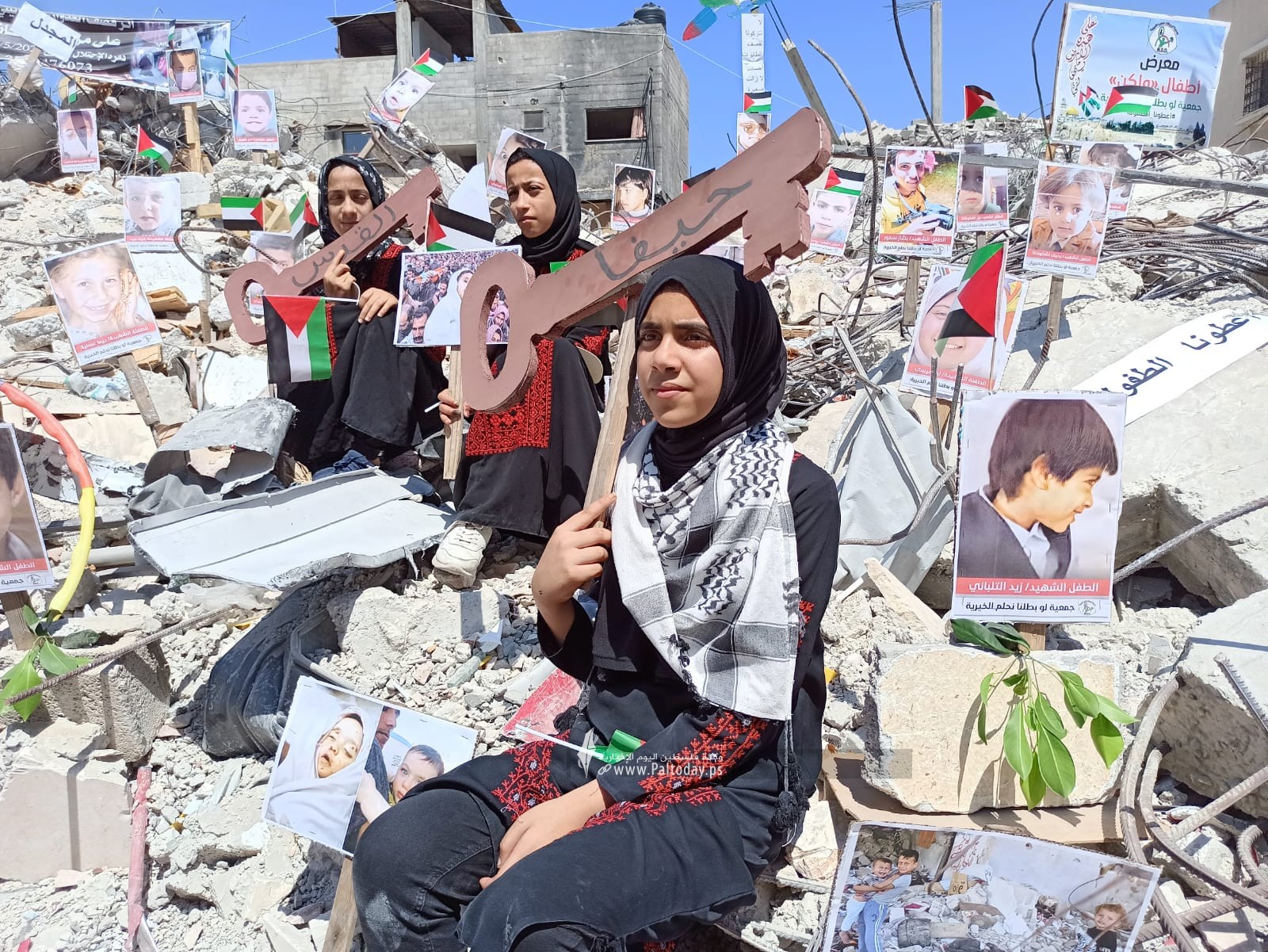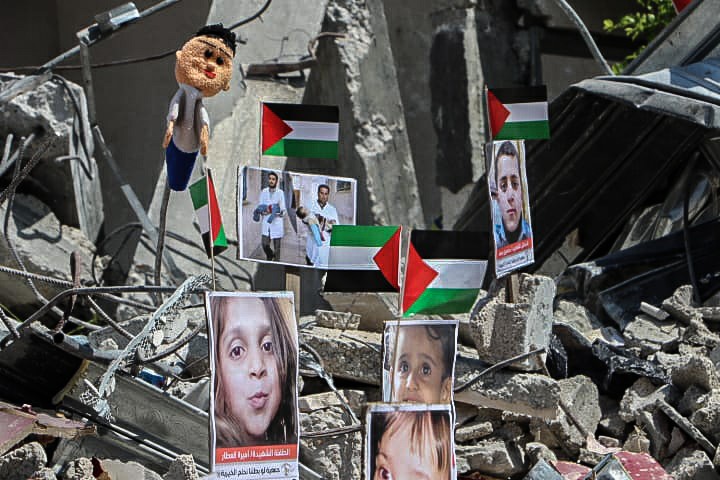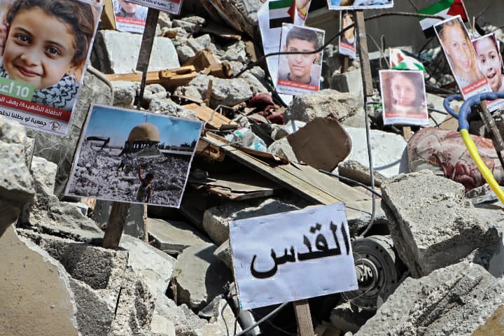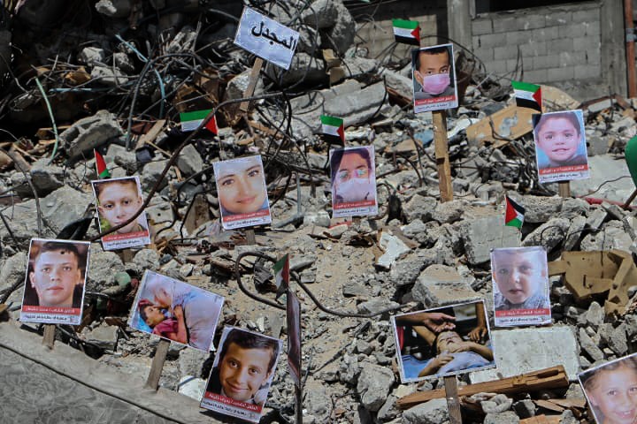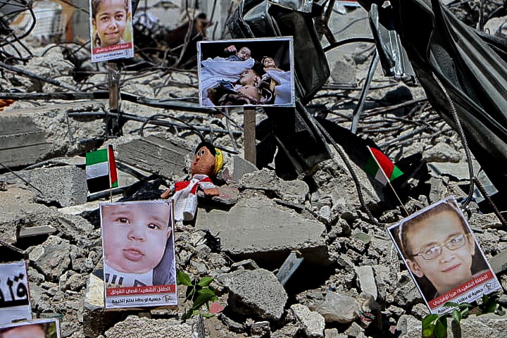 Pictures of Palestinian Children Killed in Israeli Aggression Installed in Gaza Rubbles