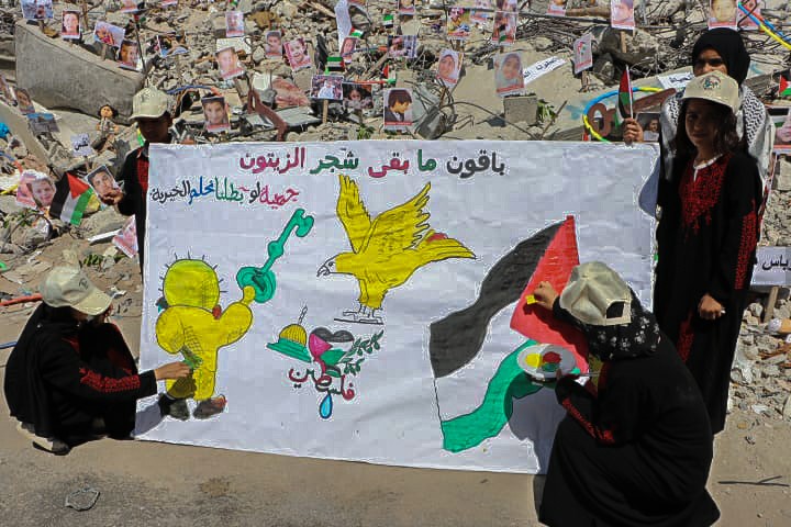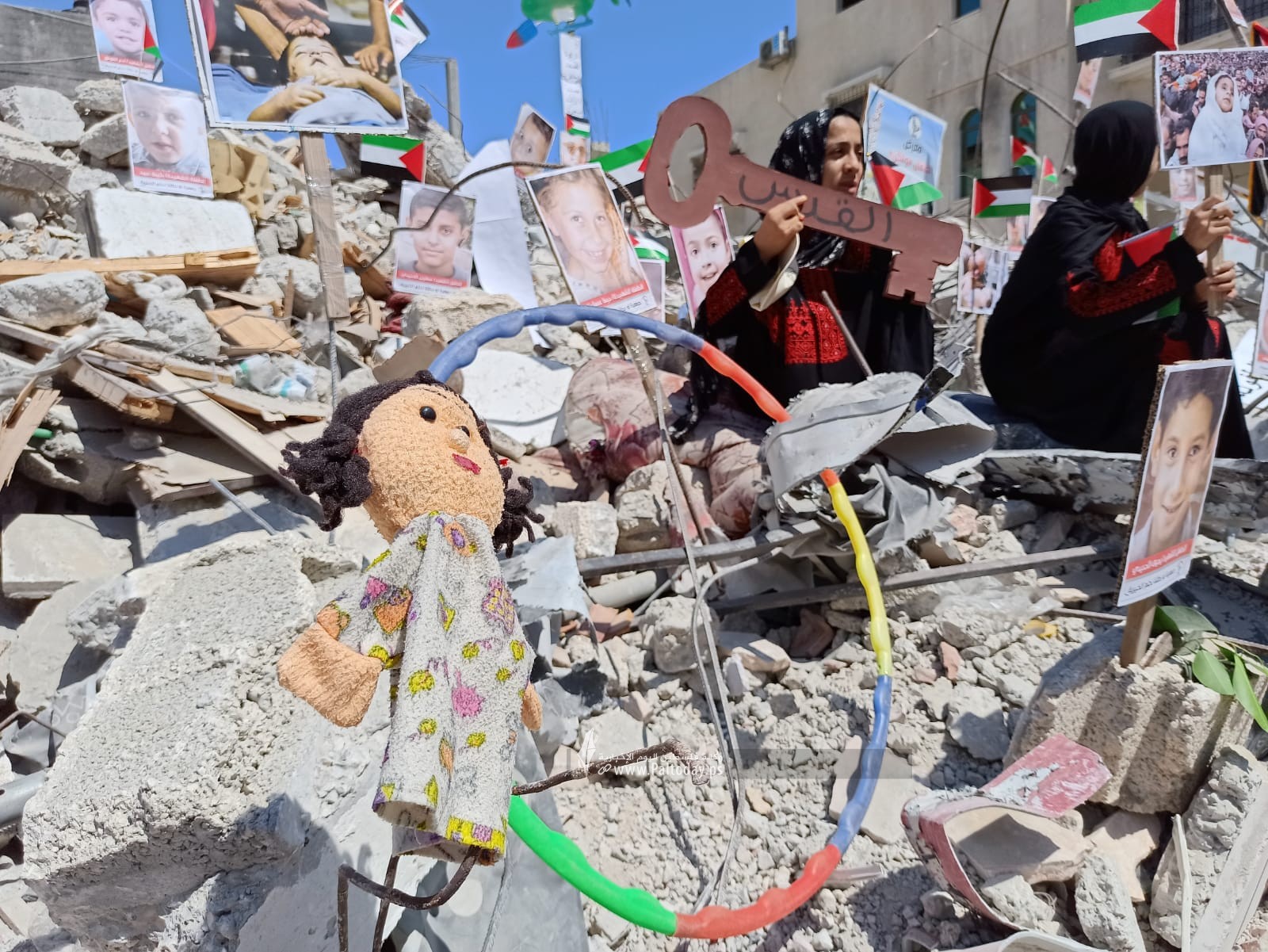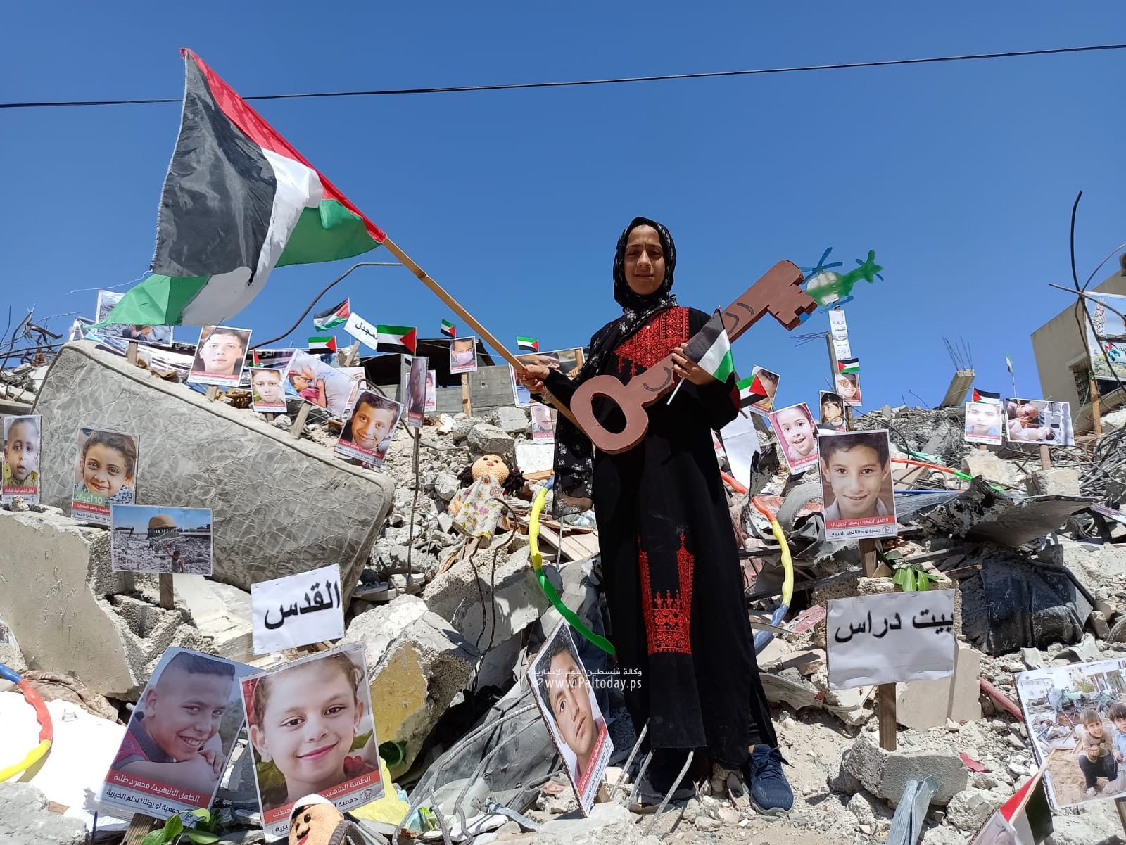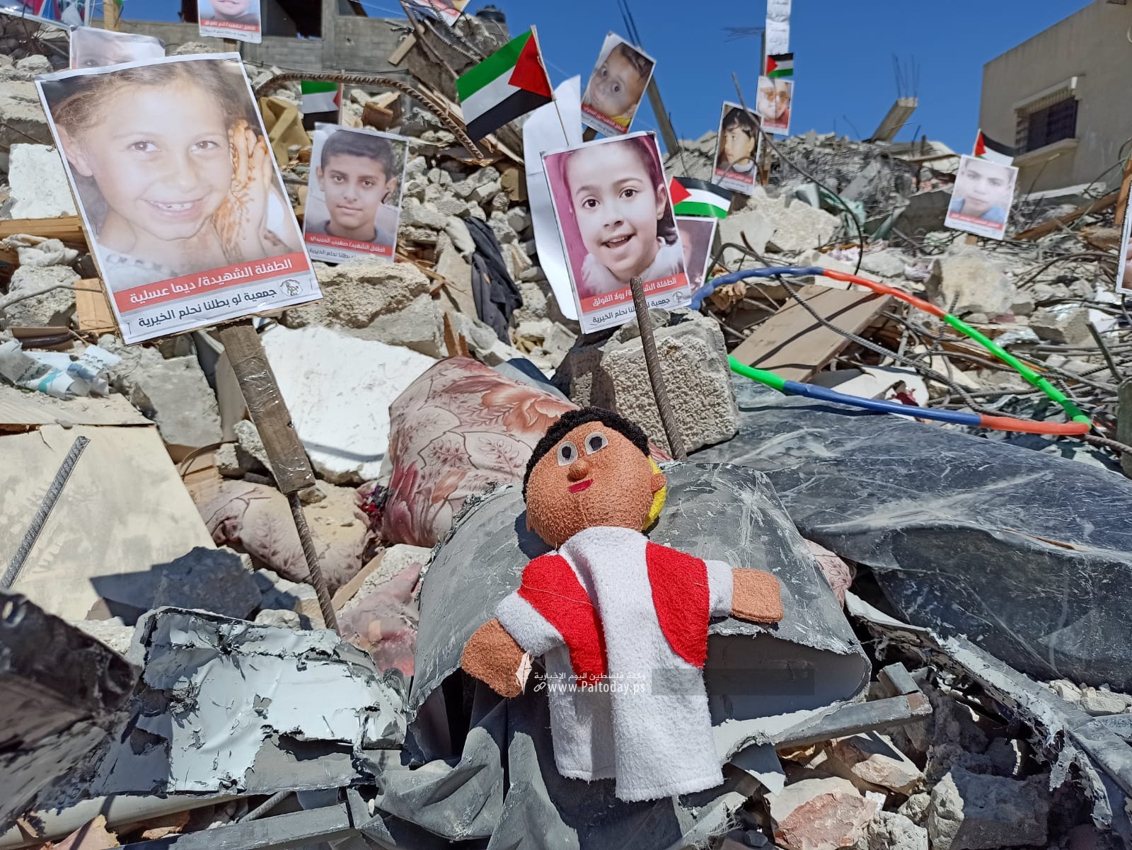 Pictures of Palestinian Children Killed in Israeli Aggression Installed in Gaza Rubbles