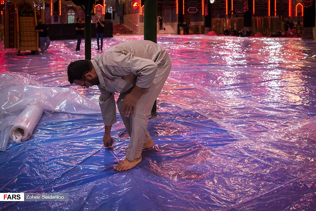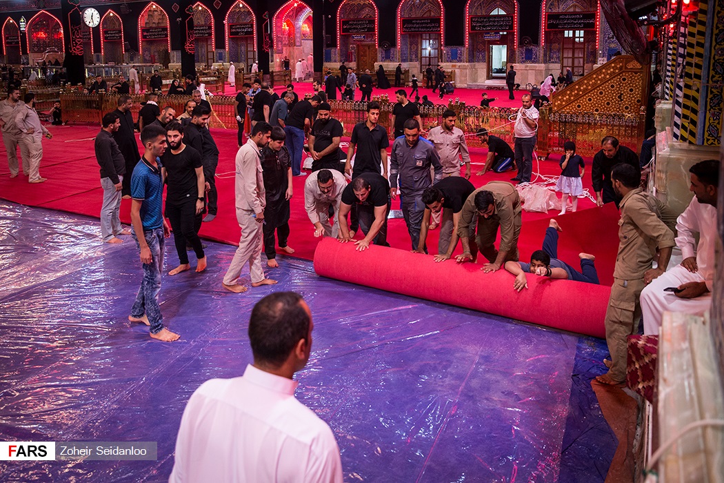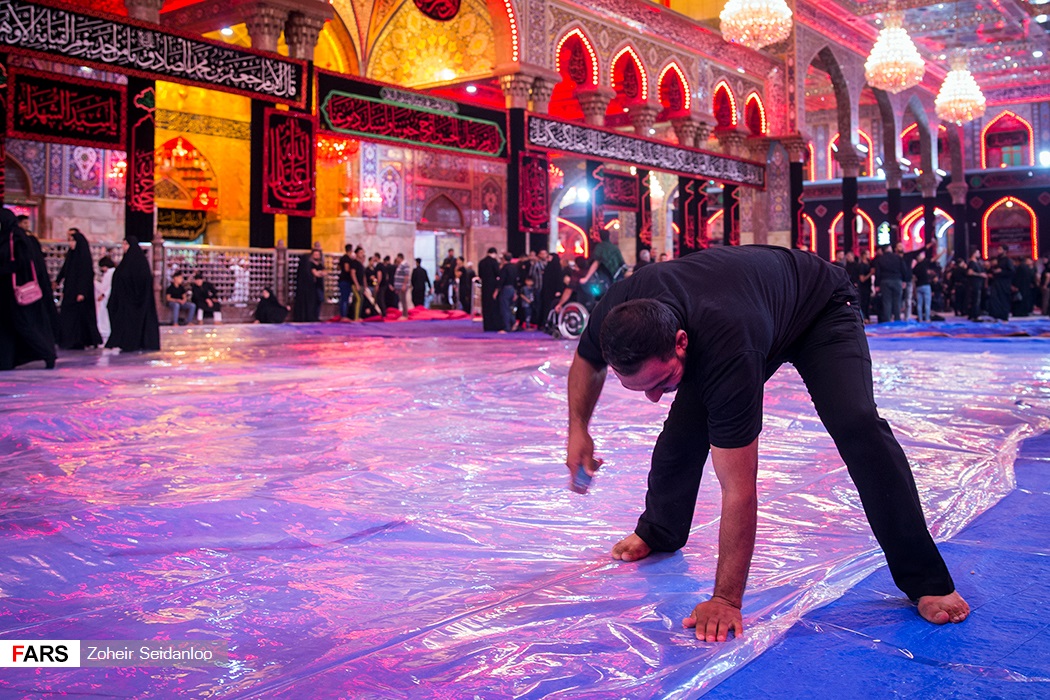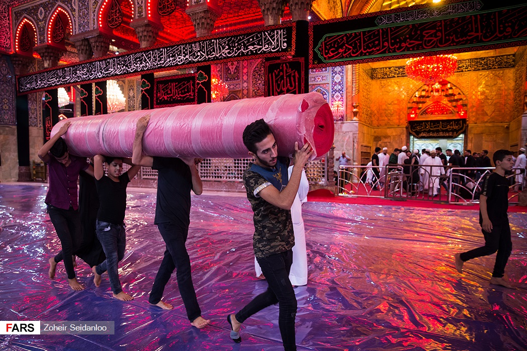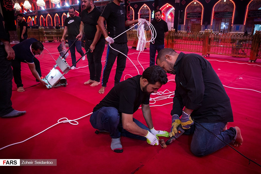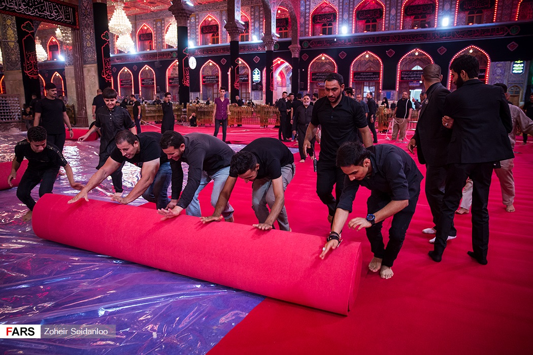 صحن حرم مطهر امام حسین(ع) به منظور استقبال از جمعیت میلیونی زائران و عزاداران محرم و اربعین و تسهیل تردد با فرش قرمز مفروش شد.