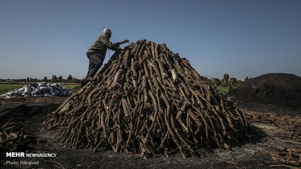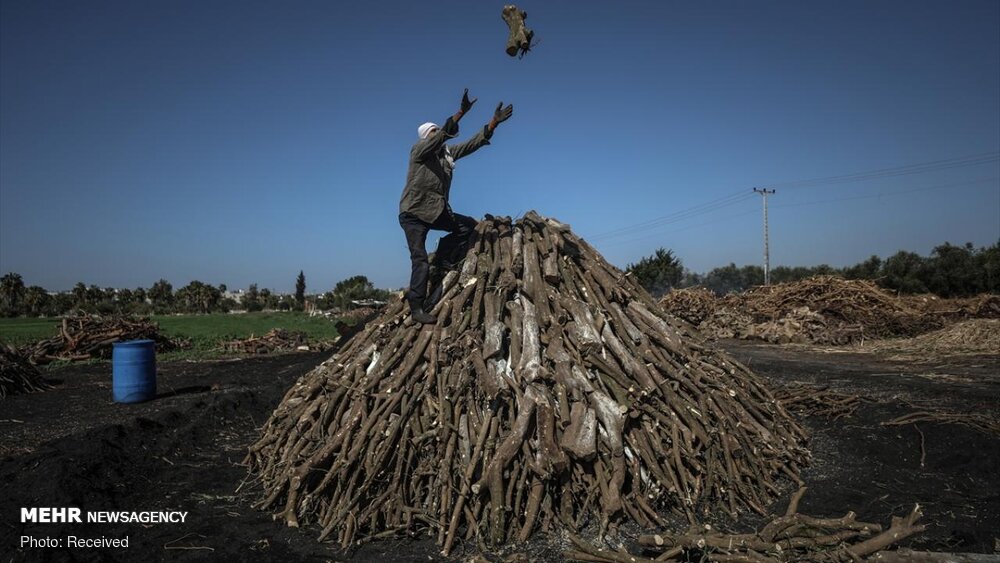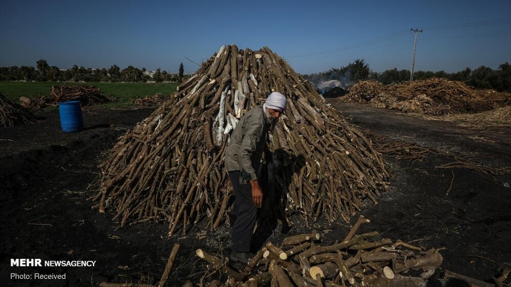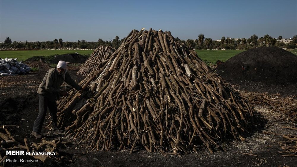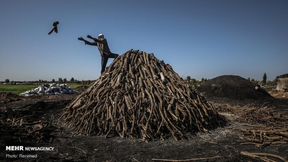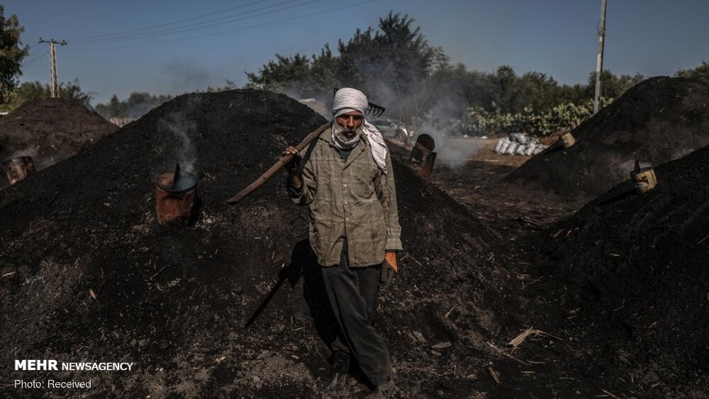 مردان فلسطینی در کارگاه تولید زغال چوب در شرق غزه کار میکنند، کارگران پس از بریدن درختان چوبها را به صورت هرمی شکل قرار میدهند و زغال را به شیوه سنتی تولید میکنند.