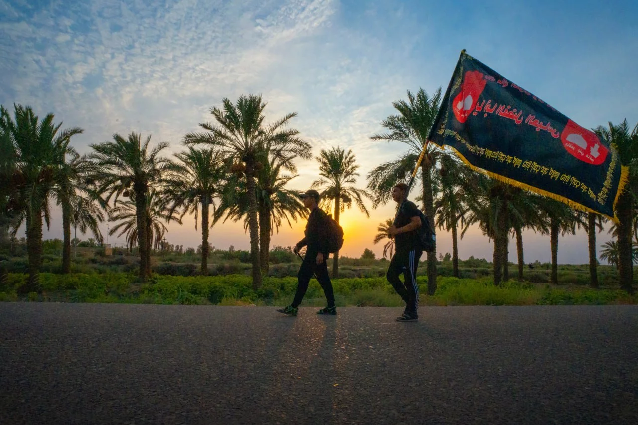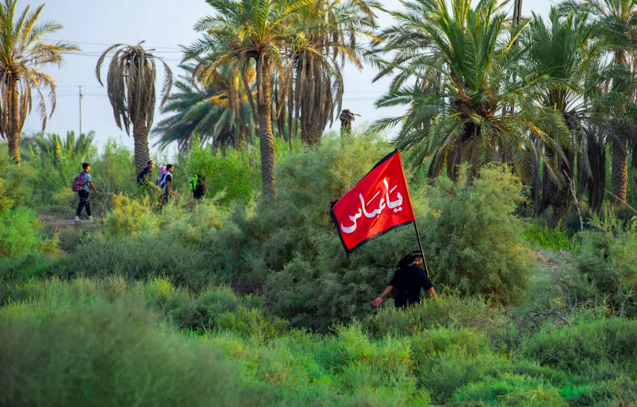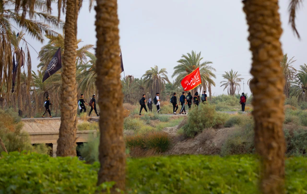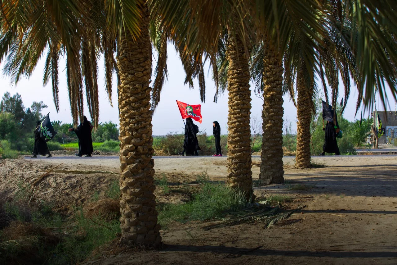 زائران حرم امام حسین (ع) در مسیر پیاده روی خود به سمت کربلای معلی از بین نخلستان ها و مناظر طبیعی عراق عبور می کنند.