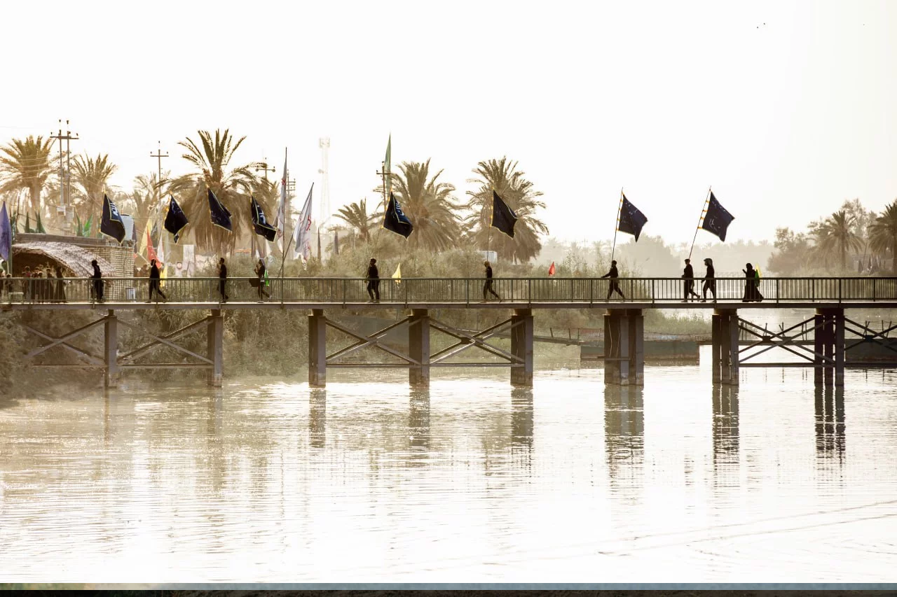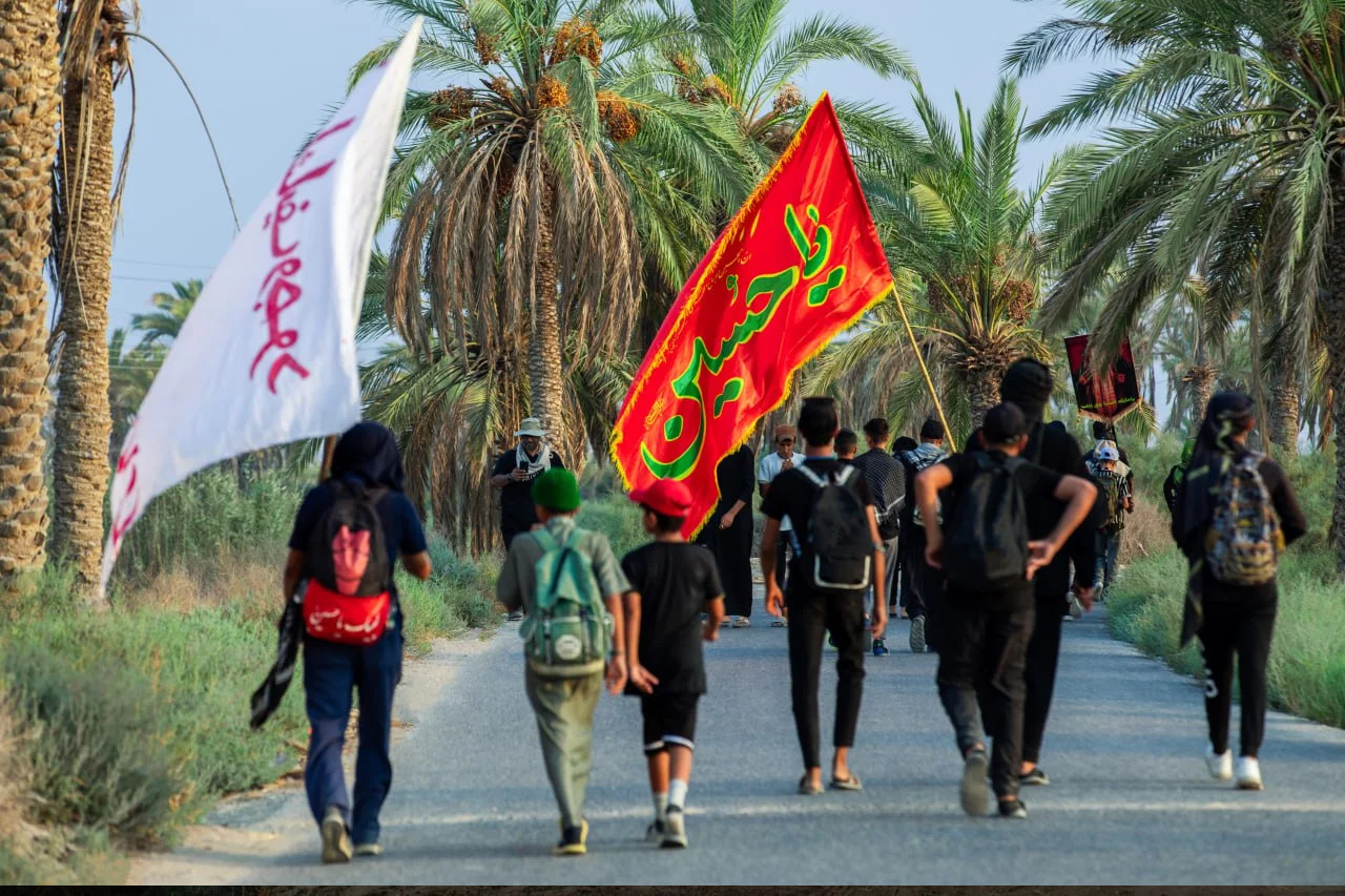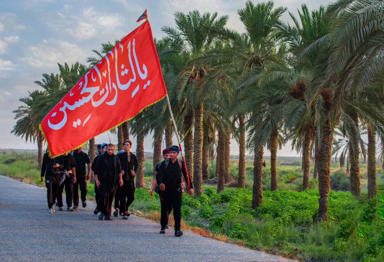 زائران حرم امام حسین (ع) در مسیر پیاده روی خود به سمت کربلای معلی از بین نخلستان ها و مناظر طبیعی عراق عبور می کنند.
