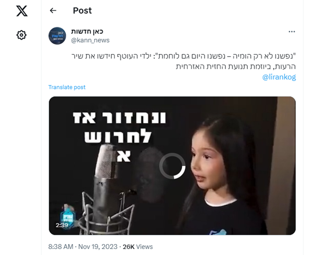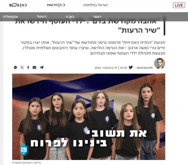 شبکه تلویزیونی دولتی اسرائیل، کان، آهنگی را در X (توئیتر سابق) بارگذاری کرد که در آن کودکان صهیونیست کمپین کشتار جمعی فلسطینیان را در غزه توسط ارتش اسرائیل، تحسین و از آن حمایت میکنند؛ بگذریم از این که نام این شعر سیاه و ضدانسانی، به نحوی متناقض، «سرود دوستی» است!